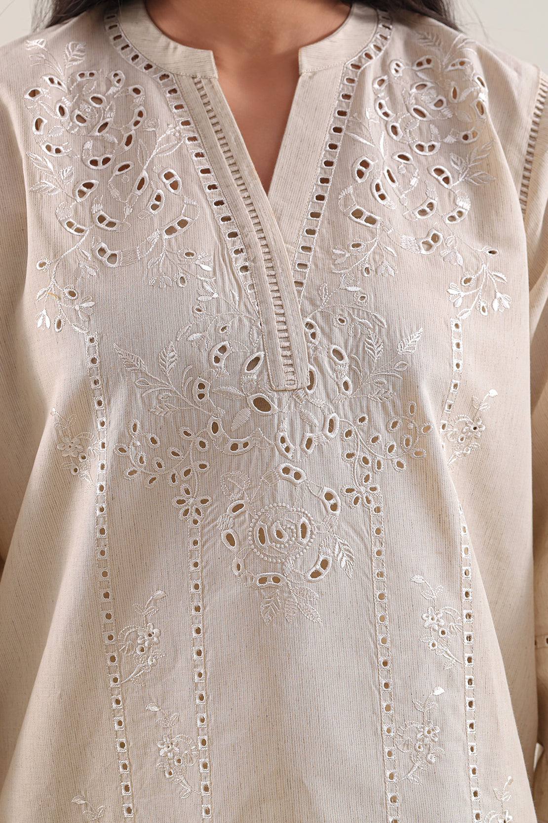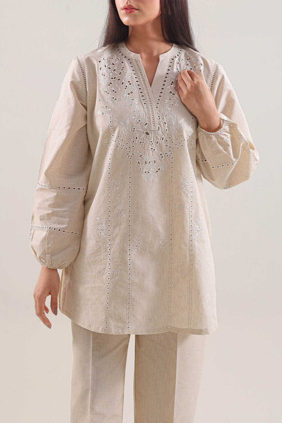 Embrace Casual Elegance With The SAYA Solid Embroidered Cotton-Linen 2-Piece Set, Crafted From A Blend Of Cotton And Linen. This Fabric Combines The Softness And Breathability Of Cotton With The Airy, Moisture-Wicking Qualities Of Linen, Making It Perfect For All-Day Comfort. The Shirt Features Delicate Embroidery That Enhances The Fabric’s Natural Texture Without Overpowering The Minimalist Aesthetic. Its Classic Collar And Clean Stitching Offer A Tailored, Polished Look, While The Trouser Comes With A Straight Cut And Elastic Waist For Easy Movement And Relaxed Fit.