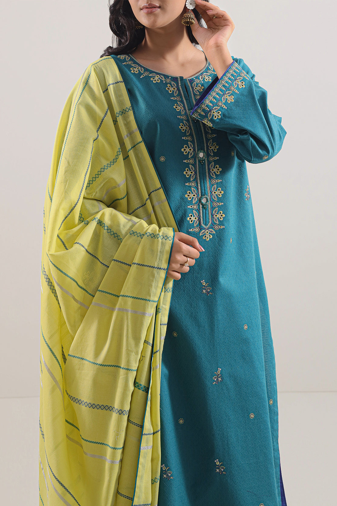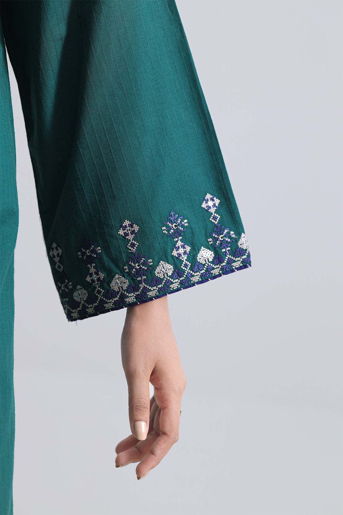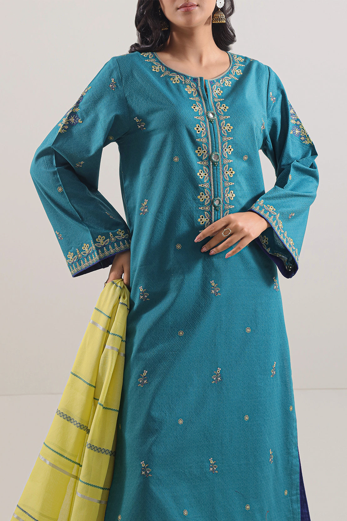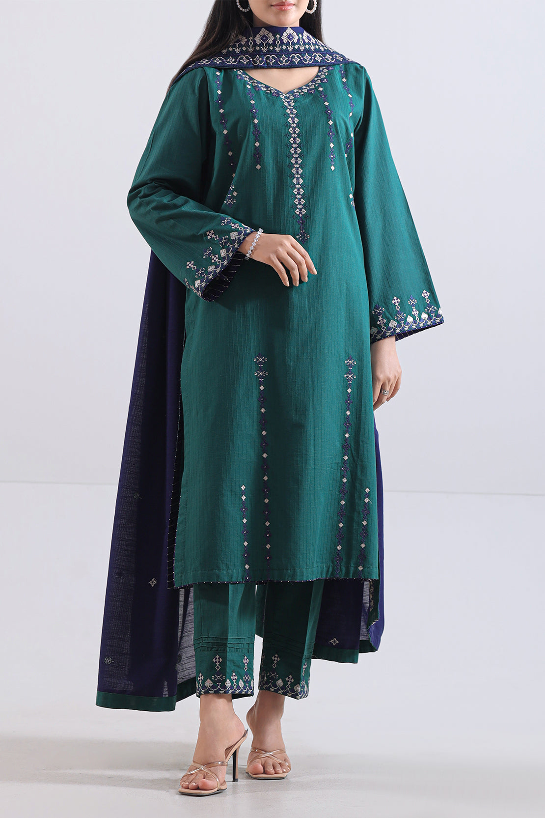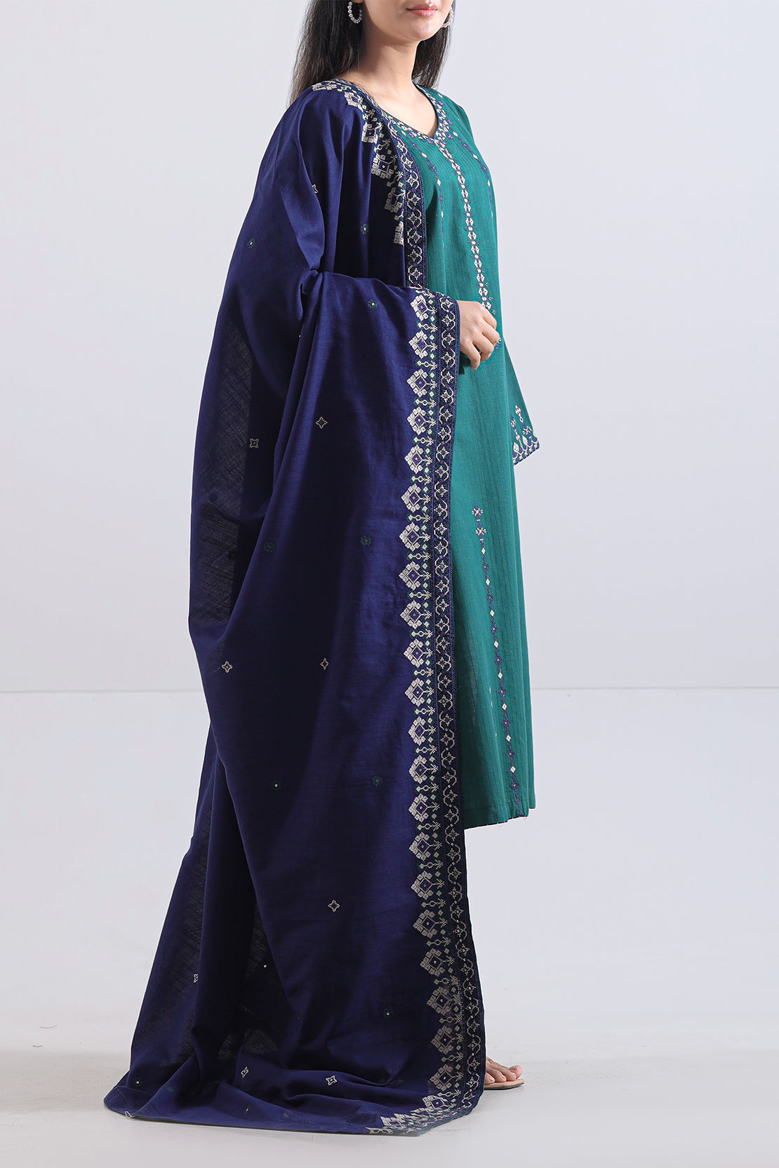 Solid Embroidered Slub Cotton Stitched 3 Piece