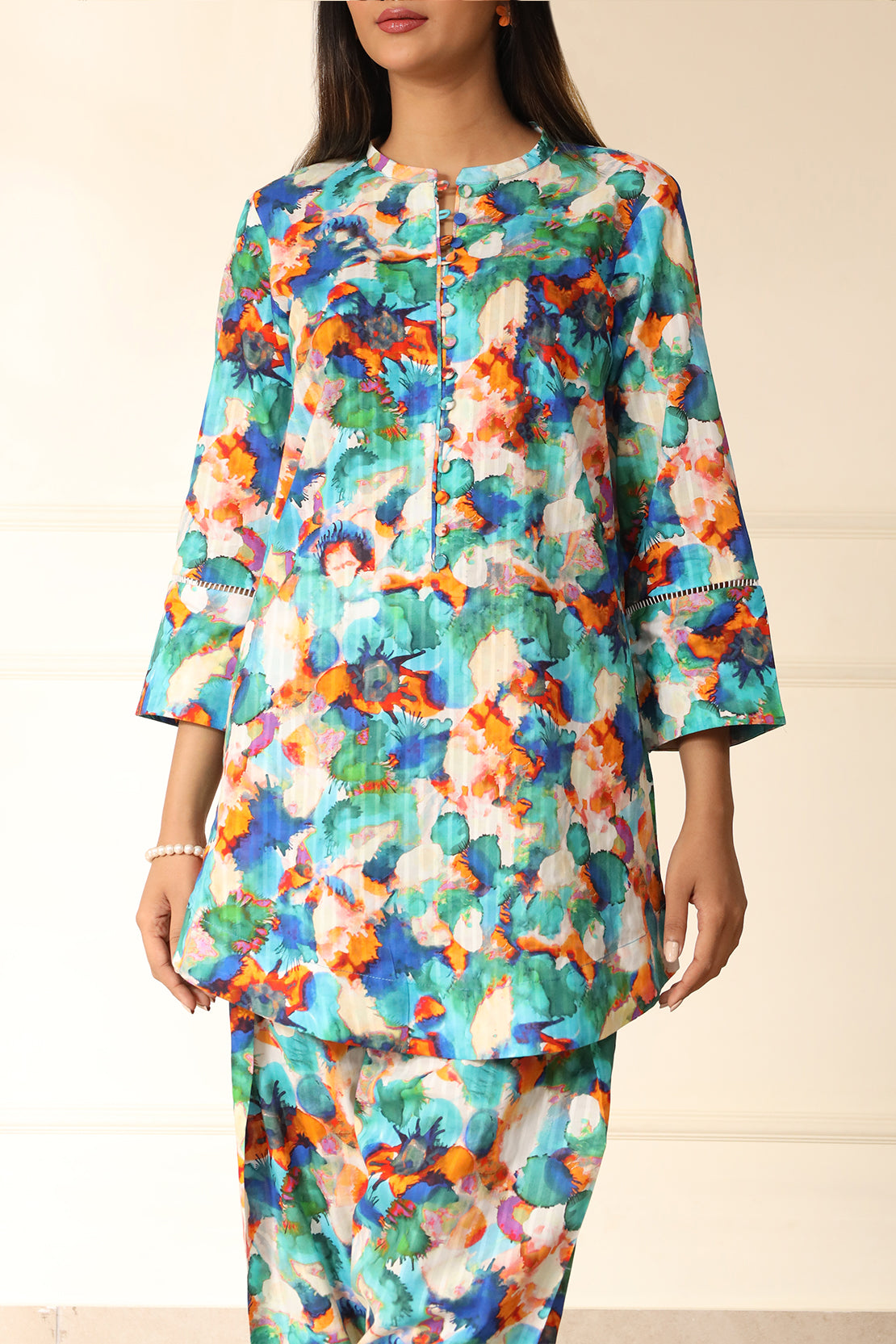 Elevate your summer wardrobe with Saya's Unstitched Printed Lawn Shirt/Trouser set in a vibrant multicolor palette. Crafted from premium self-stripe lawn fabric, this ensemble offers both comfort and elegance. Perfect for casual outings and semi-formal gatherings, it reflects Saya's commitment to quality and contemporary design.