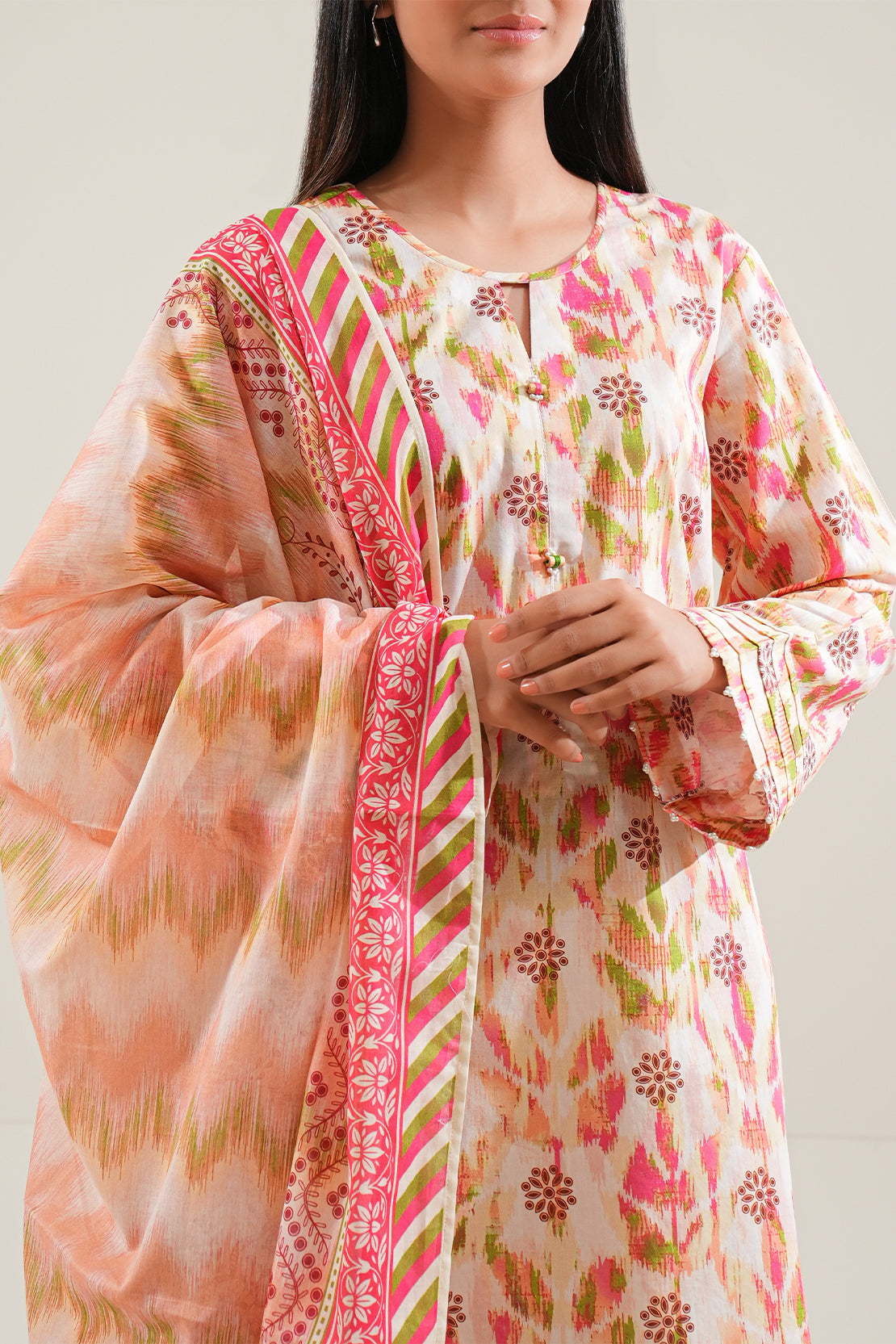Capture The Essence Of Summer With This Unstitched Printed Lawn 3-Piece By SAYA. Crafted On Breathable Lawn Fabric, The Outfit Features An Artistic Blend Of Traditional And Contemporary Motifs In Refreshing Tones. Paired With A Printed Lawn Dupatta And Trouser, This Ensemble Promises Effortless Style And Comfort For Seasonal Festivities Or Daywear.