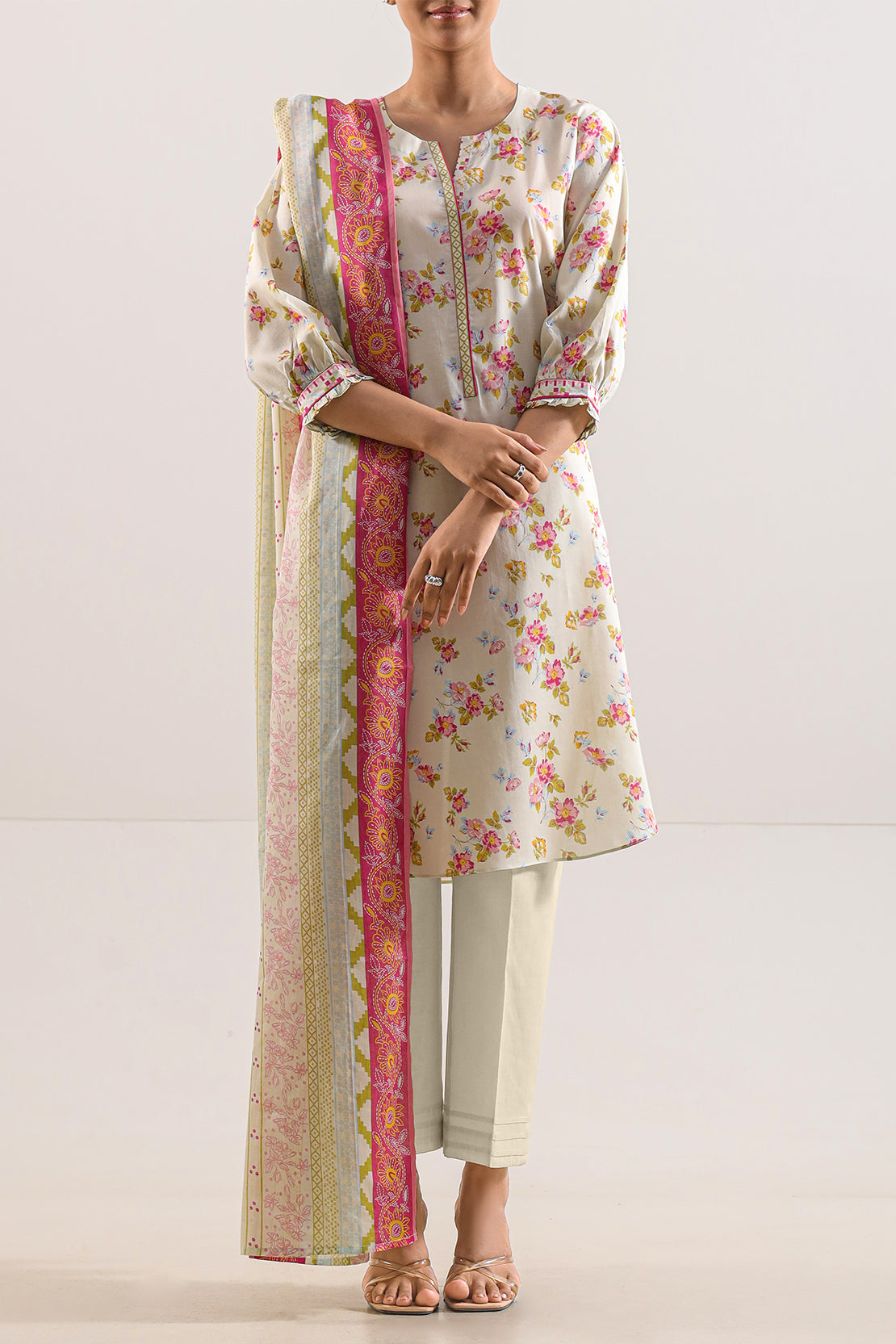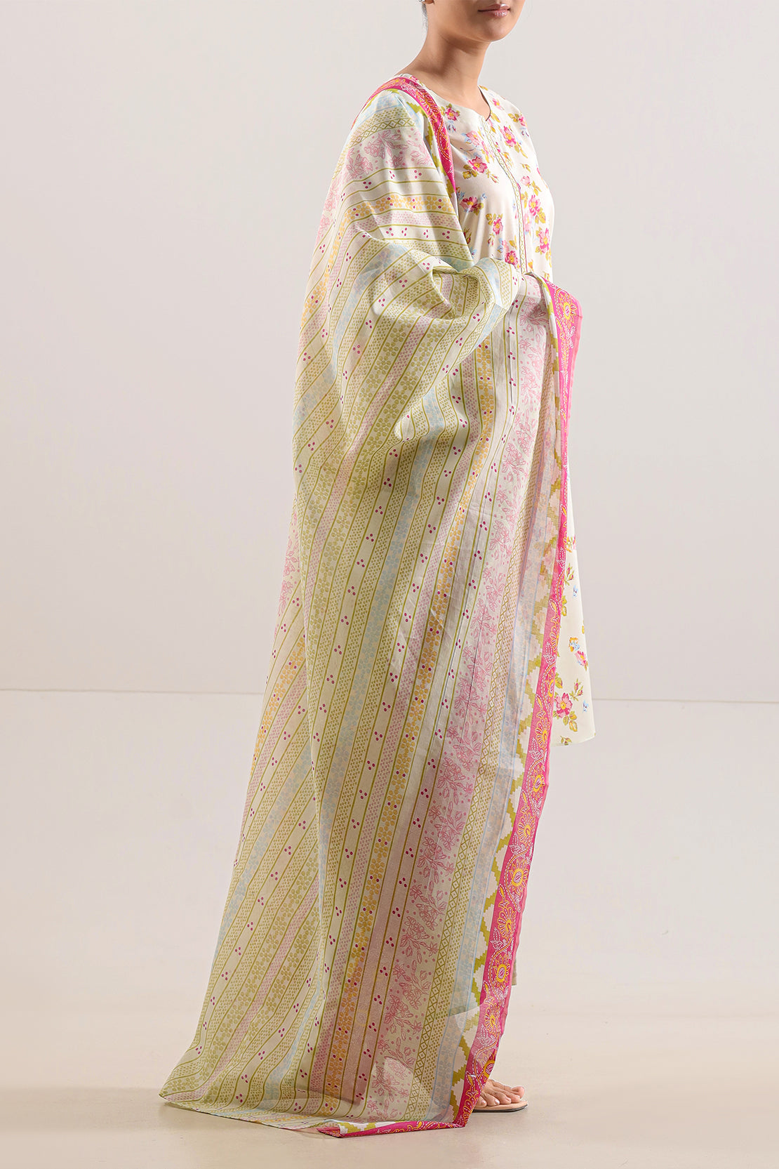 Crafted In Premium Feather-Light Lawn Fabric, This Ensemble Boasts Timeless Breathability And A Graceful Drape—Ideal For Warmer Seasons. The Shirt Features A Delicate, Harmonious All-Over Print, Infusing Subtle Elegance And Soft Visual Texture. The Coordinated Printed Dupatta Enhances Flow And Feminine Charm, While The Dyed Cambric Trouser Adds Structure And Comfort. Tailoring-Ready And Thoughtfully Designed, This Trio Balances Personalized Style Freedom With Everyday Sophistication—Perfect For Daytime Events, Casual Celebrations, Or Your Custom Couture Creations.