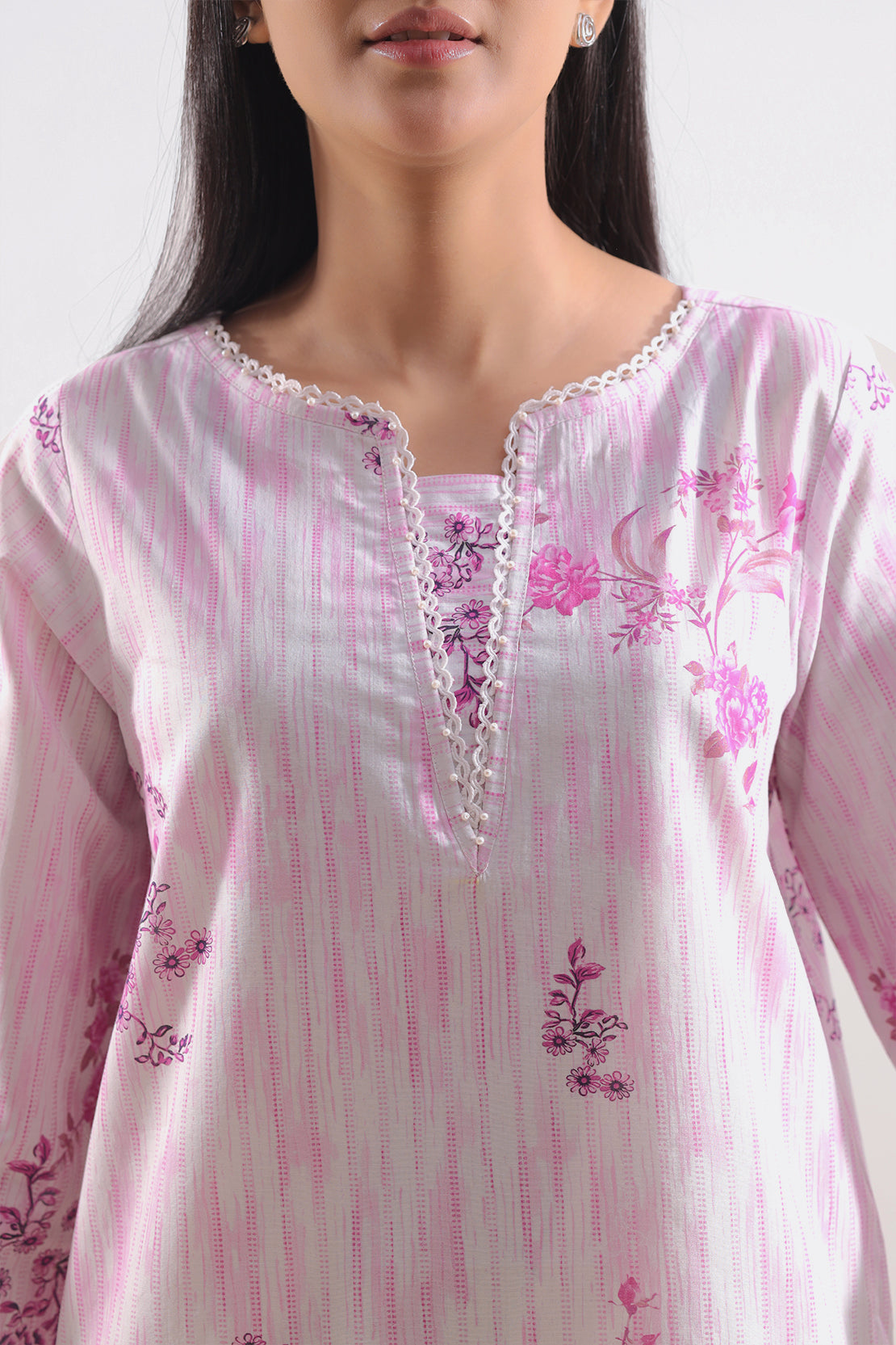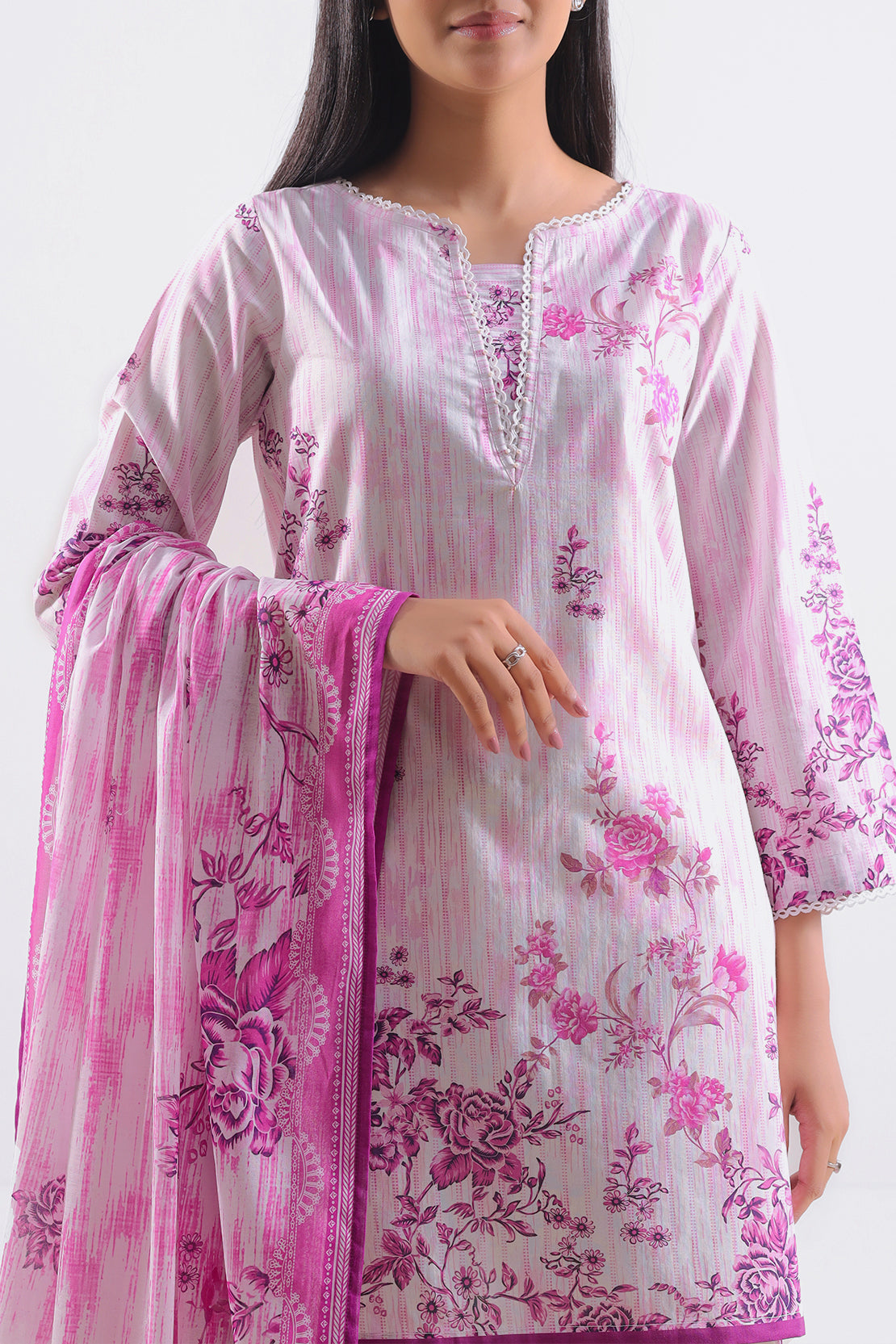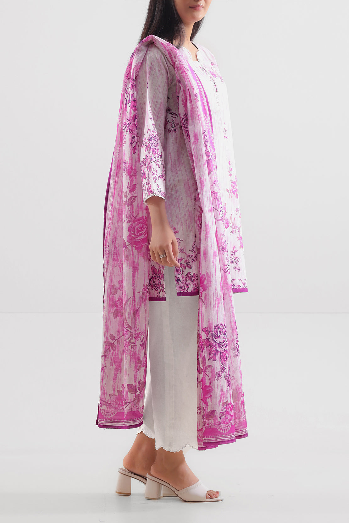 Pastel Pink 3-Piece Unstitched Set From SAYA Offers Premium Printed Lawn Shirt And Dupatta With Matching Dyed Cambric Trouser. Shirt Comes In A Wider Cut For Custom Styling; Dupatta Adds Elegant Extension; Trouser Brings Subtle Structure. Lightweight Lawn Fabric Gives Breathability And Comfort, Ideal For Festive And Daytime Events. Soft Pink Color Balances Feminine Charm With Elegant Versatility.