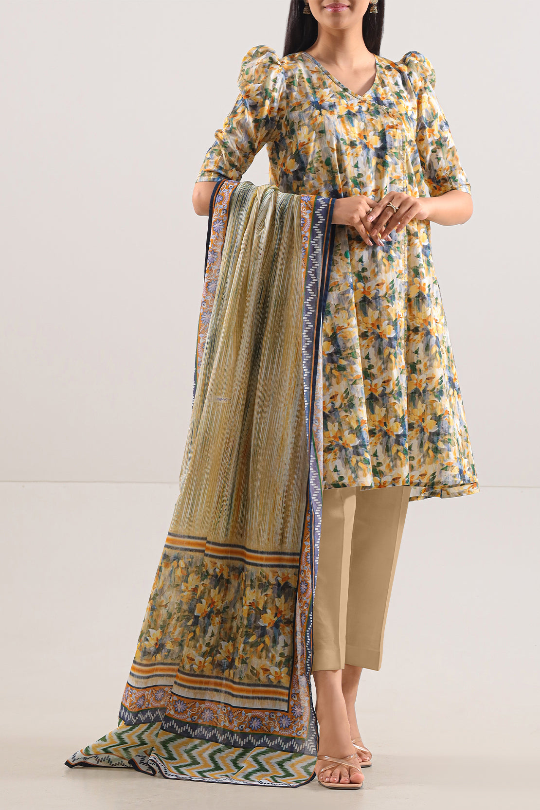 Refresh your summer repertoire with this elegant Beige unstitched 3-piece set from SAYA. Crafted from ultralight, breathable lawn fabric, the outfit includes a generously cut printed shirt tailored for customization, a gracefully draped printed lawn dupatta, and a dyed cambric trouser for structured comfort. Combining timeless elegance with tailored versatility, it’s perfect for crafting personalized daywear, casual gatherings, or light festive ensembles.