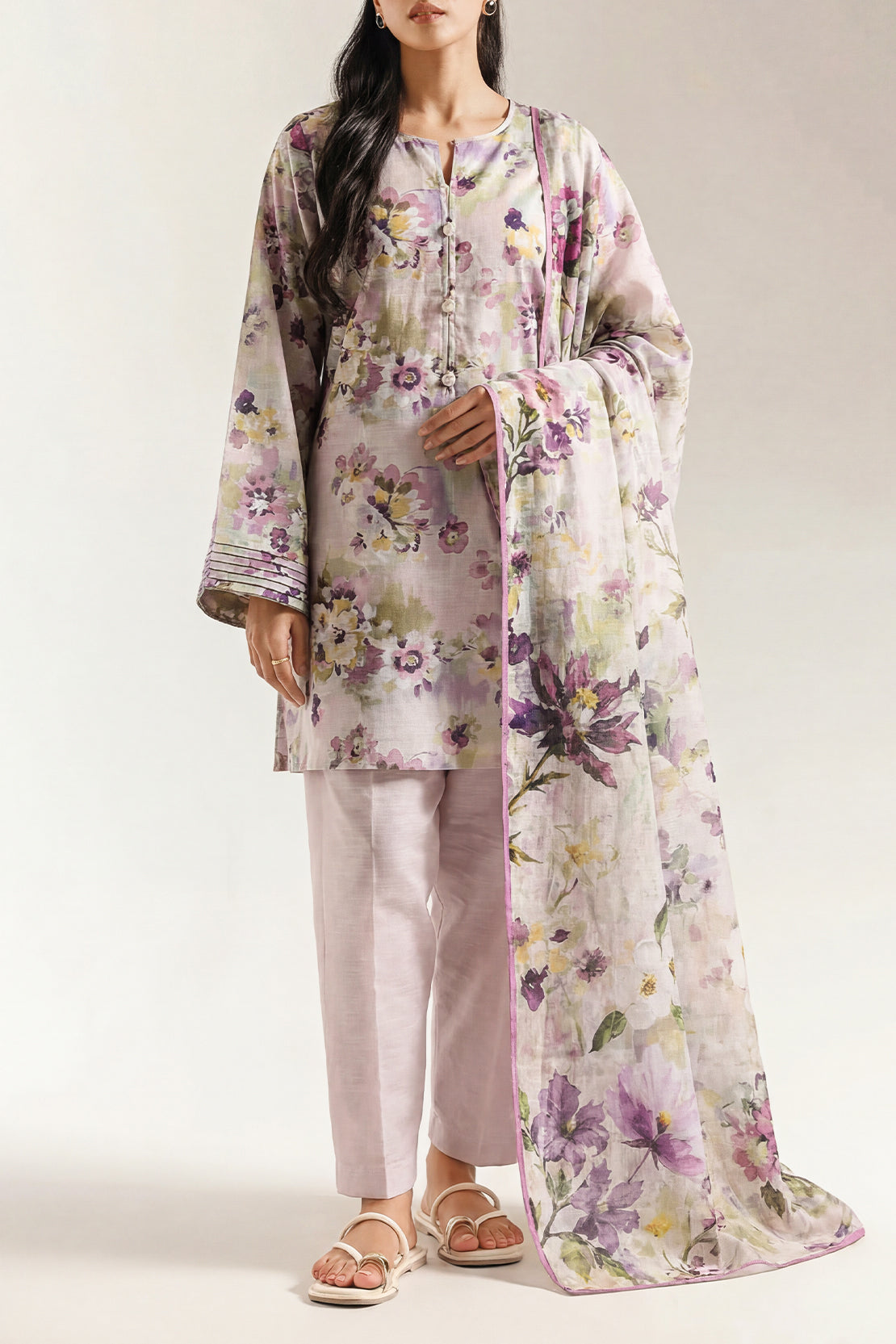 SAYA's Unstitched Printed Lawn Three-Piece Collection Showcases A Vibrant, All-Over Pattern On, Breathable Fabric. This Ensemble, Including A Shirt, Trouser, And Dupatta, Is Designed For Custom Tailoring To Achieve A Perfect Personalized Fit. Ideal For Creating Sophisticated Summer Wear For Casual Outings, Daytime Events, And Warm-Weather Gatherings, It Delivers Unmatched Softness, Versatile Styling, And Effortless Elegance.