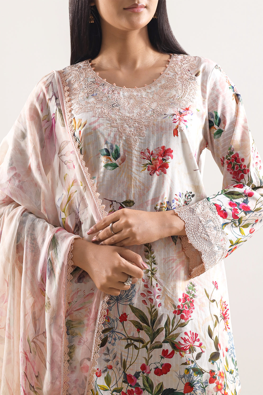 Unstitched Printed Embroidered Cotton-Tencel 3-Piece With Chiffon Dupatta By SAYA Radiates In A Soft Purple Tone. The Luxurious Blend Of Cotton And Tencel Ensures Breathability, Graceful Draping, And Gentle Skin Feel. The Shirt Panels Are Adorned With Delicate Embroidery Over An Artful Print, Merging Texture And Visual Interest. Accompanied By Matching Trouser Fabric And A Flowing Chiffon Dupatta, This Set Offers Versatility And Elegance. Perfect For Daytime Festive Events, Garden Soirées, Or Chic Casual Occasions That Demand Feminine Style And Comfort.