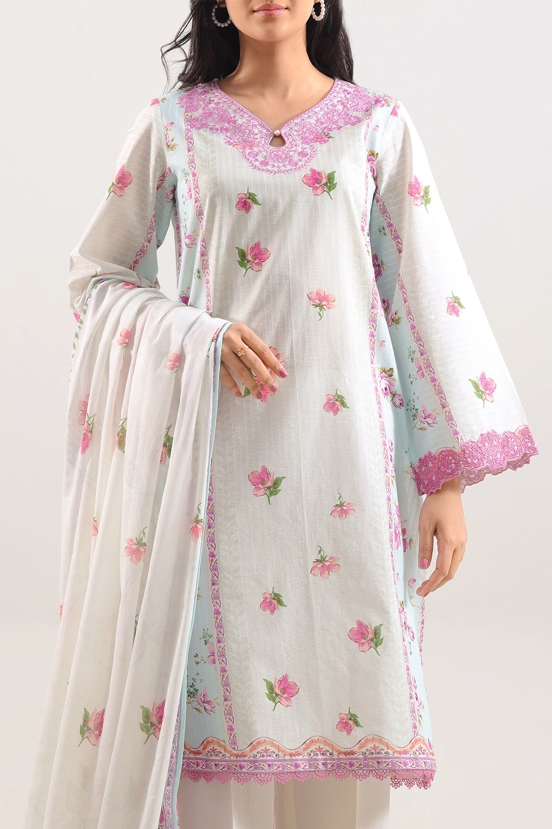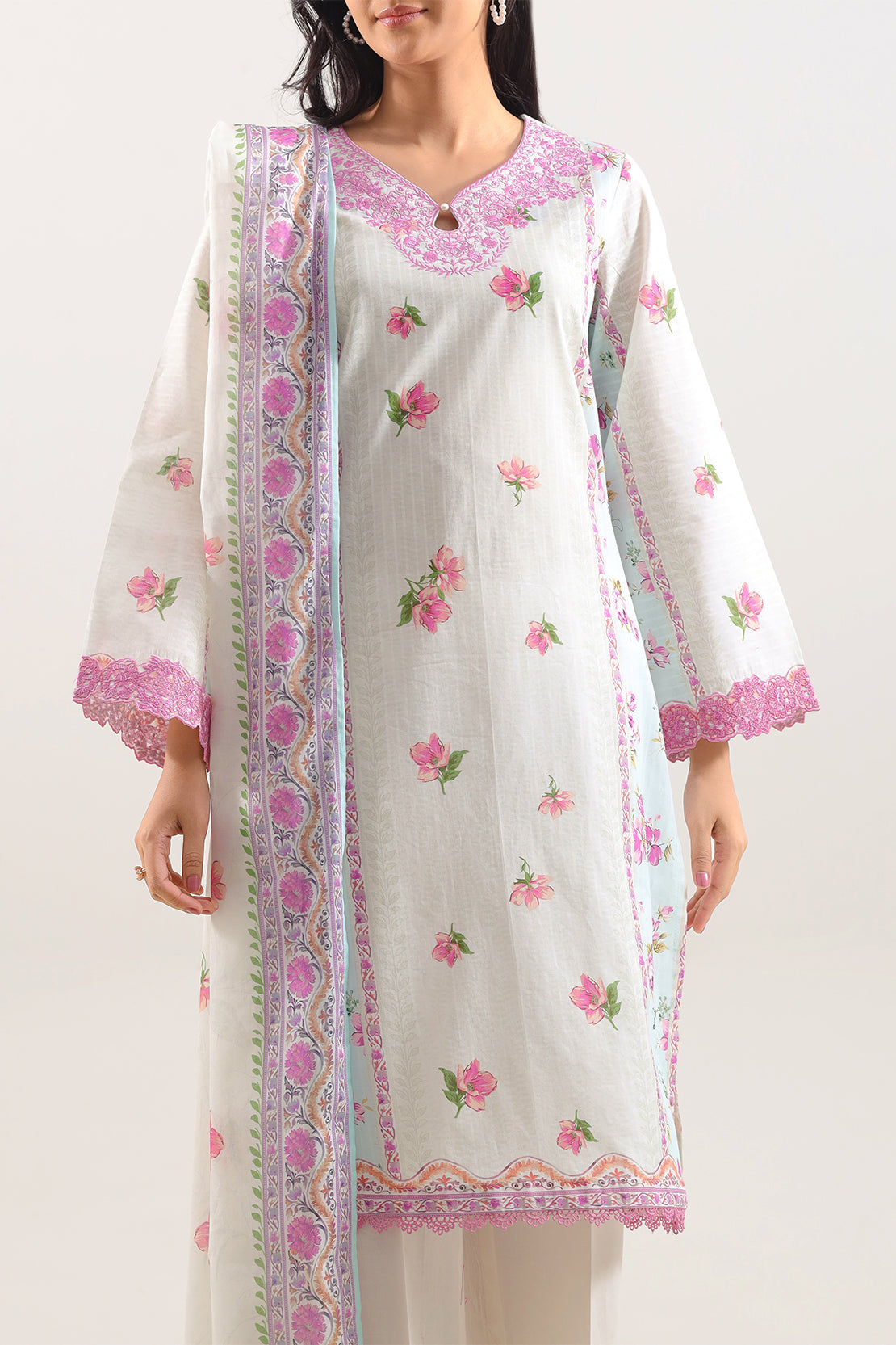 Unstitched Printed Embroidered Strip Lawn 3 Piece