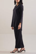 Cotton Jacquard Stitched 2-Piece By SAYA Gleams In A Distinct Black Hue. The Richly Textured Cotton Jacquard Fabric Offers Subtle Depth And Sophistication While Remaining Soft And Breathable. Its Ready-To-Wear Shirt Features Clean Tailoring, Sharp Collar, And A Polished Silhouette. Paired With A Matching Trouser, This Ensemble Delivers Seamless Style And Versatile Use. Ideal For Semi-Formal Office Looks, Casual Gatherings, Or Daytime Events Where You Want To Look Effortlessly Elegant.