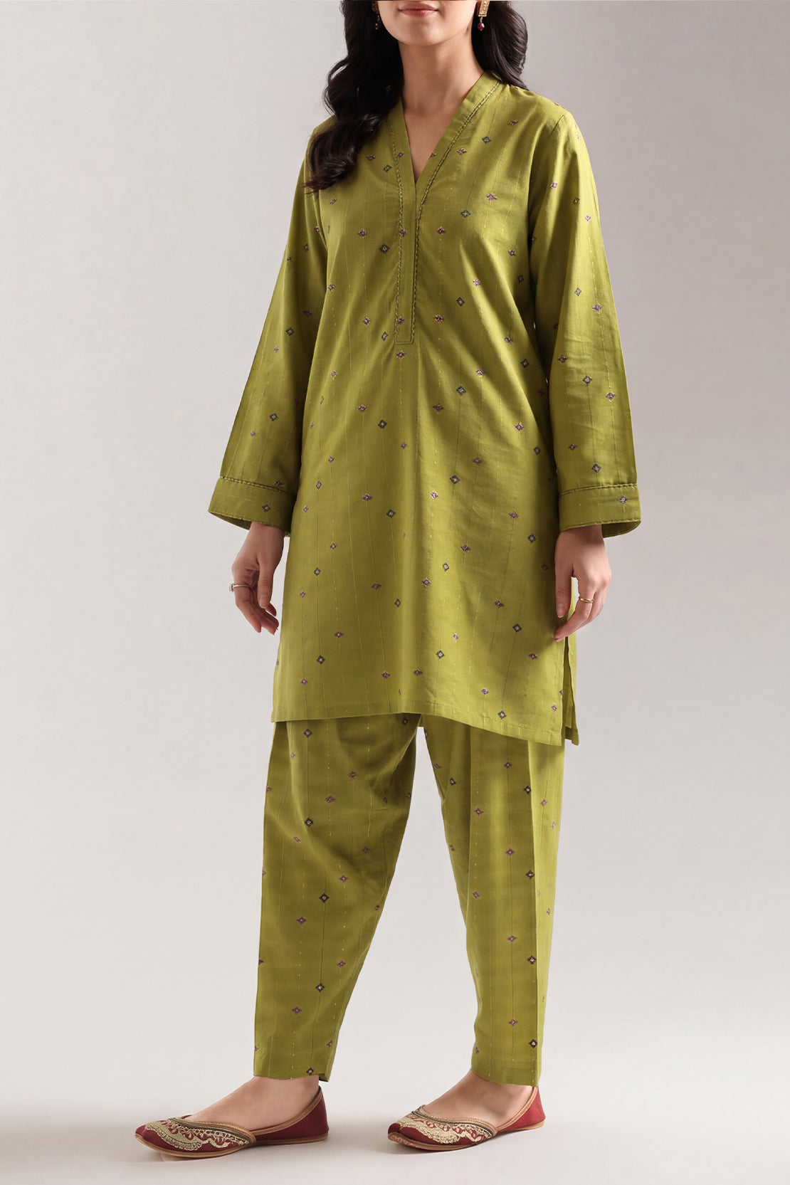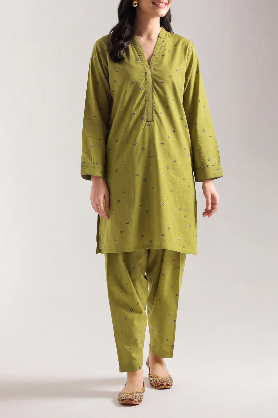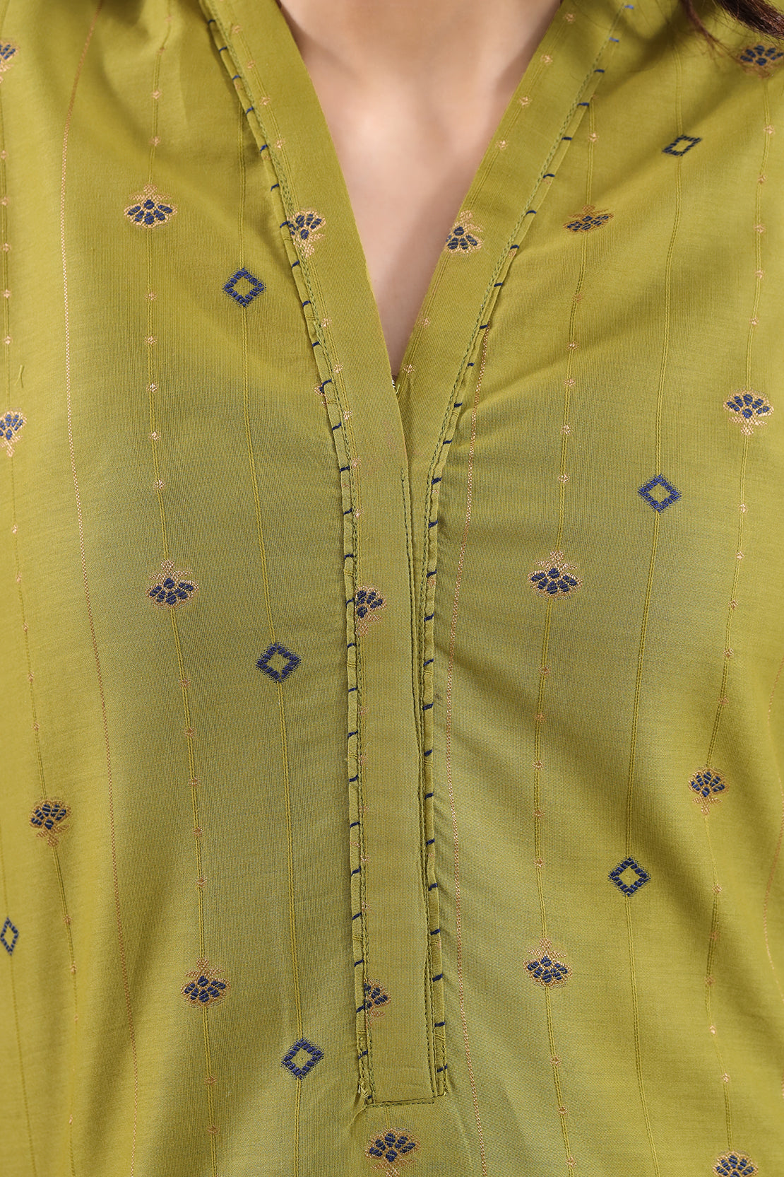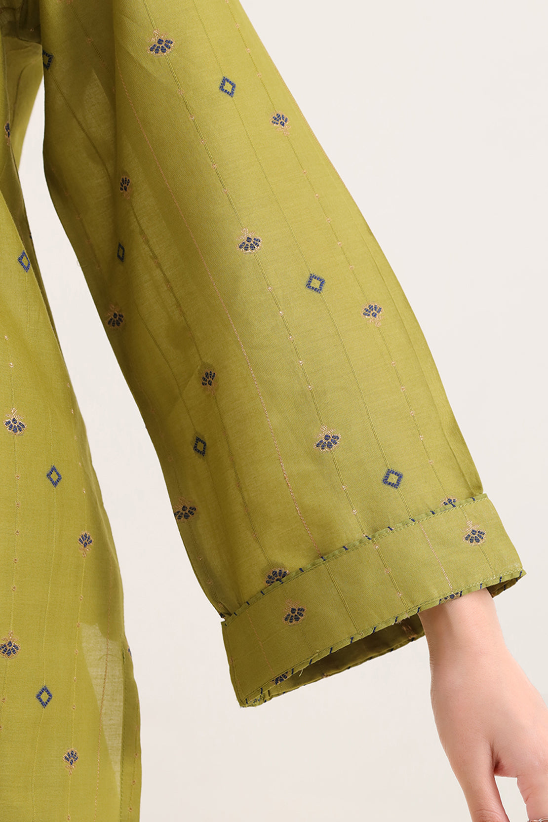 SAYA's Embroidered Cotton Jacquard Stitched Two-Piece Set Showcases Intricate Woven Texture Adorned With Delicate Hand Embroidery. Expertly Tailored For A Ready-To-Wear Fit, This Coordinated Ensemble Delivers Textural Opulence And Regal Comfort. Ideal For Grand Weddings, Formal Galas, And Distinguished Events, It Represents A Masterful Synthesis Of Heritage Craftsmanship And Contemporary, Luxurious Silhouettes.
