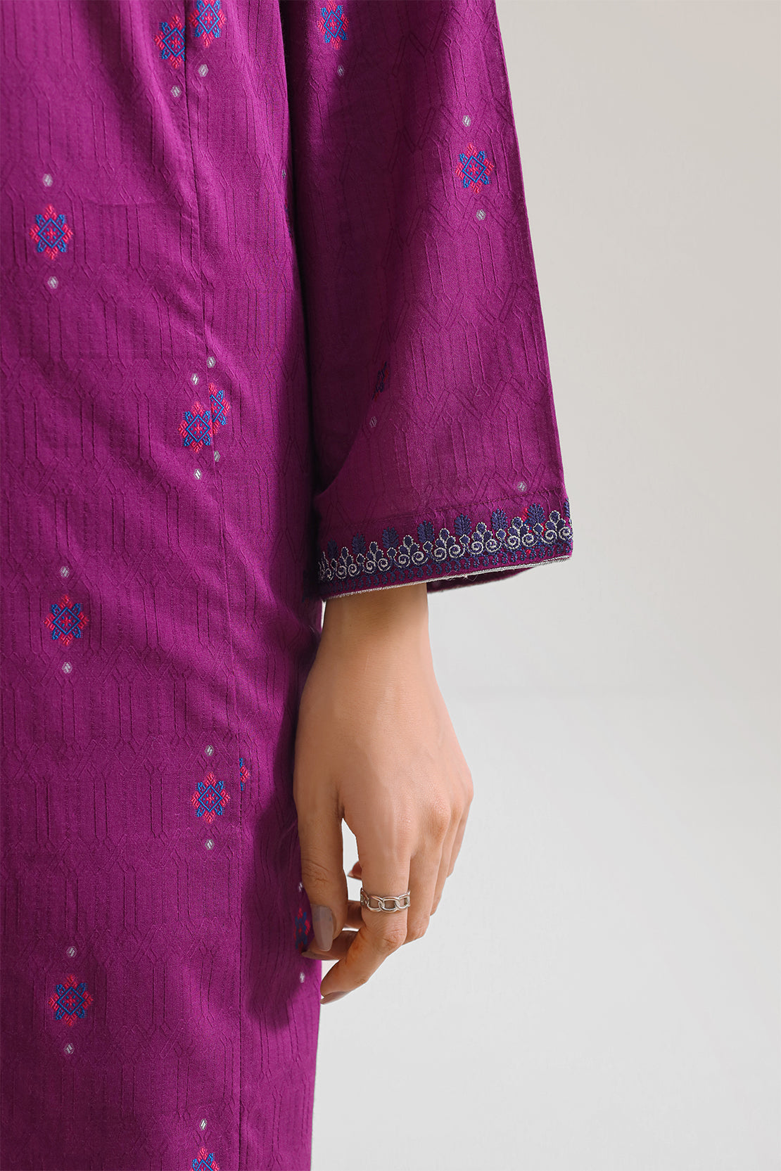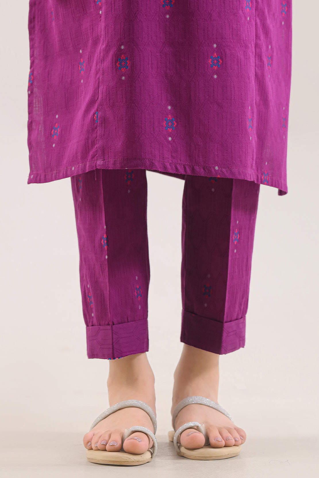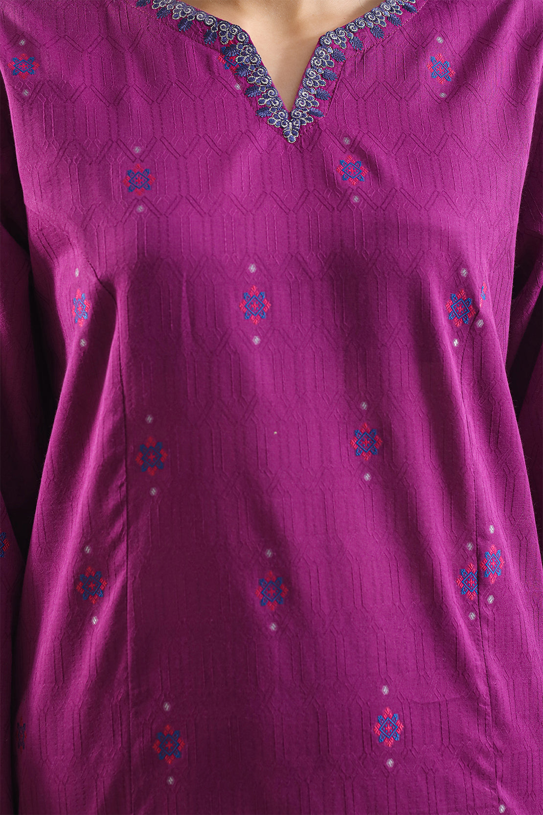 Elevate Your Everyday Wardrobe With The Embroidered Cotton Jacquard Stitched 2-Piece Set From SAYA. Crafted From Premium Cotton Jacquard Fabric With A Luxurious Texture And A Rich Plum Base, This Ready-To-Wear Ensemble Features A Fully Stitched Shirt With Refined Embroidery And A Coordinated Trouser That Completes The Look. Ideal For Semi-Formal Affairs, Smart Casual Outings Or Polished Day Wear, It Seamlessly Blends Fabric Quality, Detailed Design, Utility And Fashion — delivering elegance without effort.