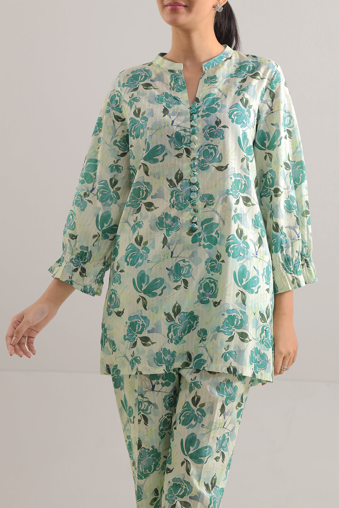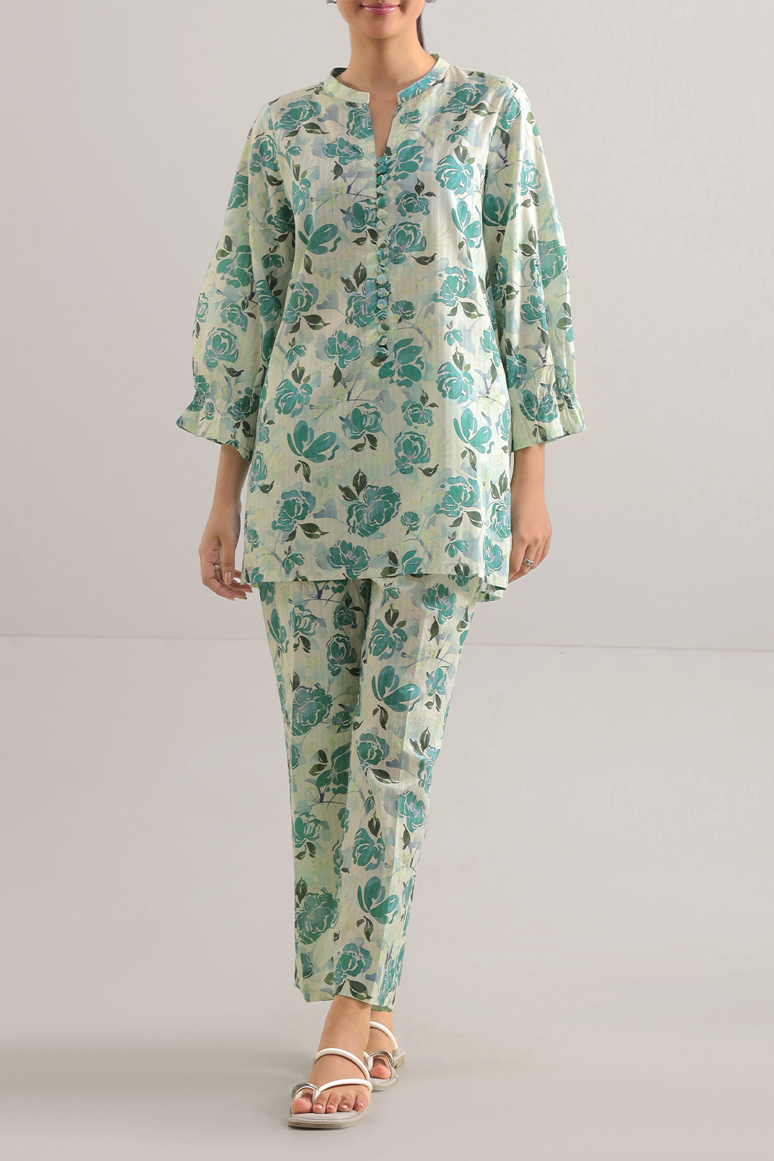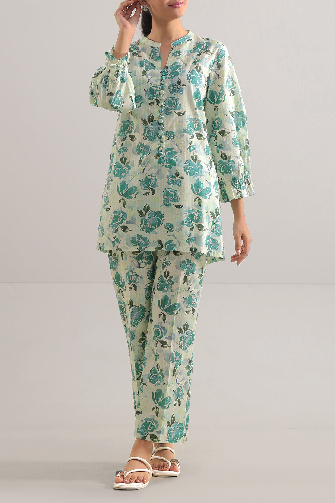 Ready-To-Wear Printed Strip Lawn Two-Piece Shirt & Trouser Set By SAYA, Tailored From Lightweight Breathable Strip Lawn Fabric For Superior Comfort And Ease. The Shirt Features Subtle Strip Print Accents Over A Rich Teal-Green Base, Offering Stylish Visual Texture Without Overpowering The Look. Accompanied By A Matching Trouser In The Same Teal Tone To Create A Cohesive Ensemble Ideal For Smart Casual Events, Daytime Outings Or Relaxed Office Wear. Precise Stitching And Quality Finish Ensure Durability And A Polished Appearance Straight Off The Rack. A Versatile, Effortless Set That Combines Fashion, Function And Seasonal Flair.