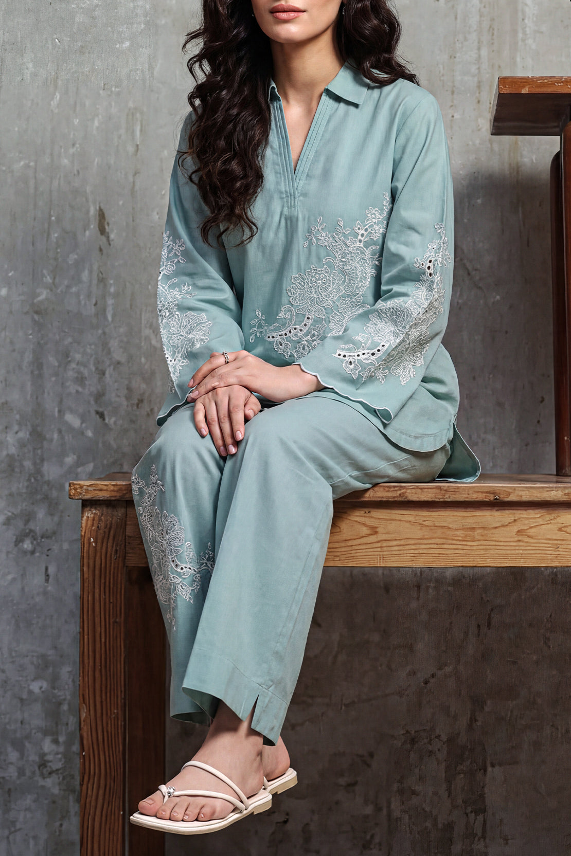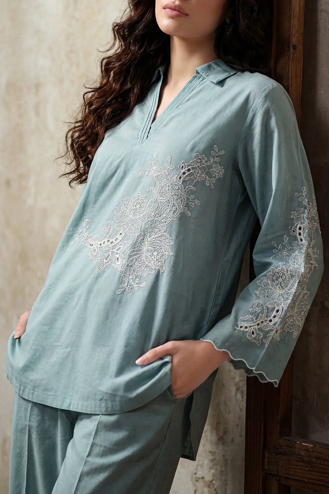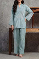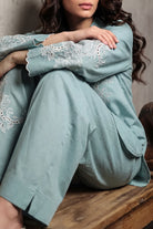 Solid Embroidered Cambric Stitched 2-Piece By SAYA Features A Sophisticated Blue Hue. Crafted From Lightweight Cambric Fabric That Ensures Breathability And Comfort, The Shirt Is Enhanced With Delicate Tone-On-Tone Embroidery Along The Front Panel. The Ready-To-Wear Trouser Matches Seamlessly With Clean Lines And A Polished Finish. This Ensemble Is Ideal For Daytime Meetings, Office Work, Or Casual Gatherings Where Simple Elegance Is Key.