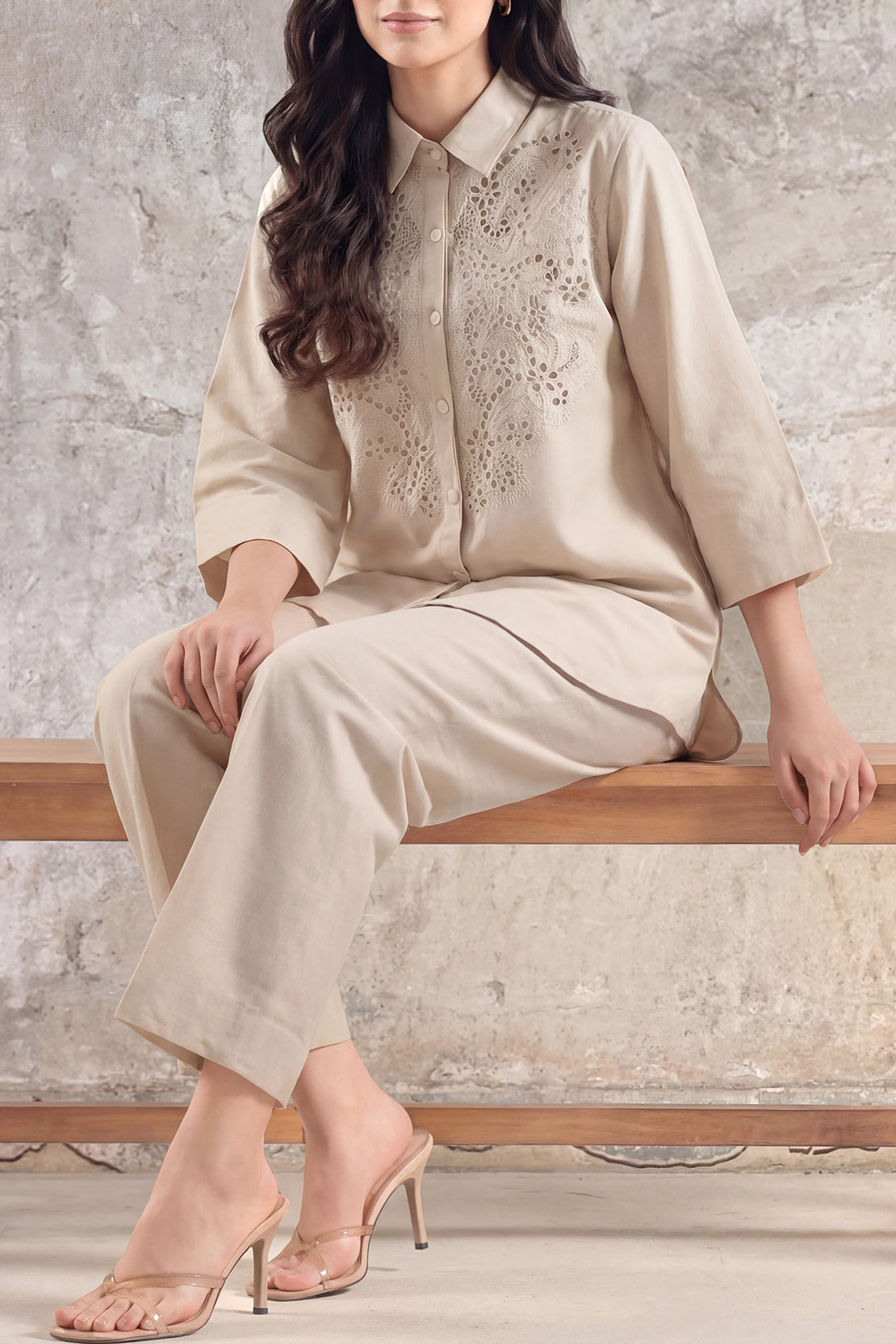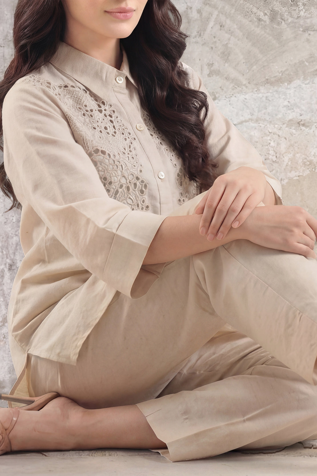 Embrace Casual Elegance With The SAYA Solid Embroidered Cotton-Linen 2-Piece Set, Crafted From A Blend Of Cotton And Linen. This Fabric Combines The Softness And Breathability Of Cotton With The Airy, Moisture-Wicking Qualities Of Linen, Making It Perfect For All-Day Comfort. The Shirt Features Delicate Embroidery That Enhances The Fabric’s Natural Texture Without Overpowering The Minimalist Aesthetic. Its Classic Collar And Clean Stitching Offer A Tailored, Polished Look, While The Trouser Comes With A Straight Cut And Elastic Waist For Easy Movement And Relaxed Fit.