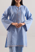 An Elegant Ice Blue Ensemble Featuring A Soft Viscose Slub Shirt With Subtle Tonal Embroidery That Enhances Textural Depth And Visual Interest. Crafted From Lightweight, Drapey Fabric That Feels Gentle Against The Skin—Ideal For Transitional Seasons. The Relaxed Shirt Silhouette Pairs Seamlessly With A Coordinated Trouser For A Polished Yet Comfortable Ready-To-Wear Look. This SAYA 2-Piece Combines Everyday Comfort, Functional Design, And Quiet Detail For Versatile Wear—from Office To Weekend Errands