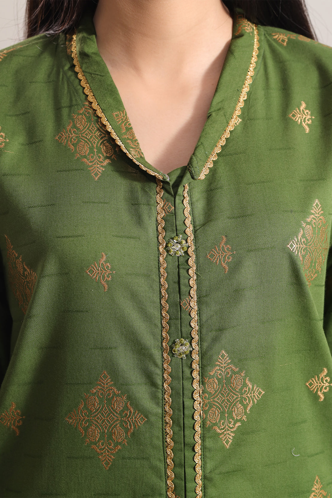 Elevate Your Ready-To-Wear Ensemble With This Exquisitely Crafted Cotton Jacquard 2-Piece From SAYA. Featured In Elegant Moss Green, The Premium Cotton Jacquard Fabric Offers A Subtle Woven Texture That Seamlessly Blends Breathable Comfort With Refined Structure. The Coordinated Ready-To-Wear Shirt And Trouser Deliver Effortless Elegance And Harmonious Styling—Perfect For Polished Daywear Or Understated Semi-Formal Moments.