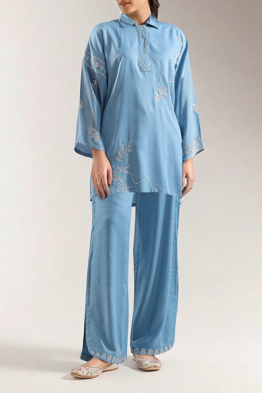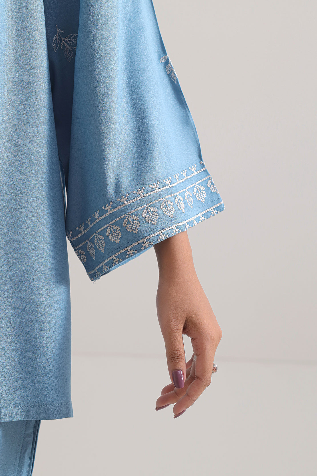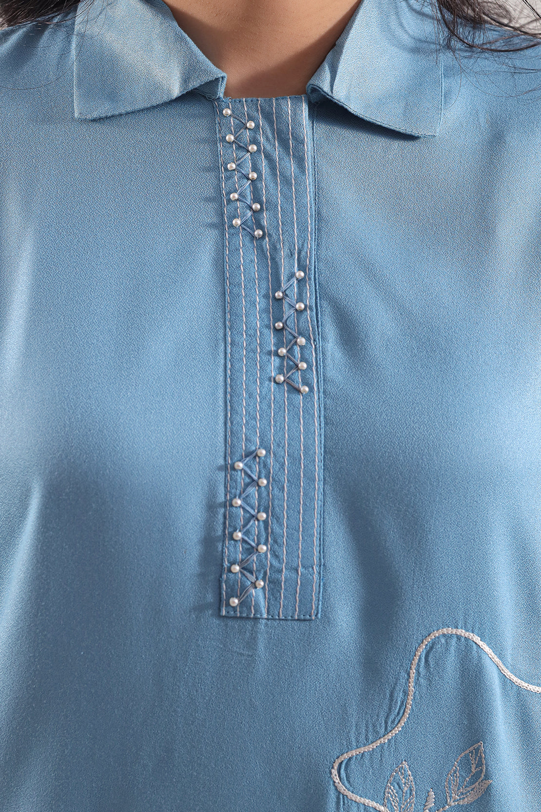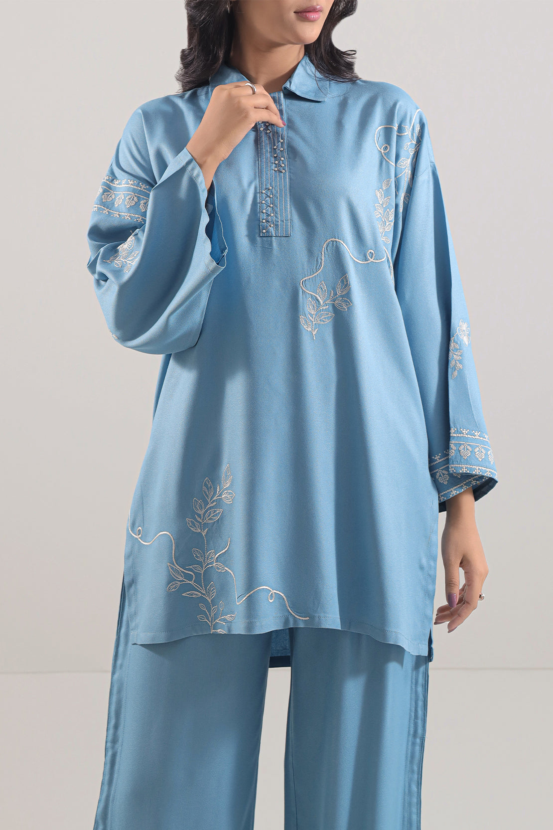 Solid Embroidered Dobby Crepe Stitched 2-Piece By SAYA Flaunts A Sleek Blue Tone. The Dobby Crepe Fabric Delivers Refined Texture And A Subtle Matte Finish, While The Tone-On-Tone Embroidery Adds Delicate Flair Without Overpowering. With Expert Stitching, A Sharp Collar, And A Clean Silhouette In The Shirt, Paired With A Matching Trouser That Offers Structure And Ease, This Ensemble Delivers Polished Style With Minimal Effort. Ideal For Office Affairs, Semi-Formal Evenings, Or Elegant Daywear.