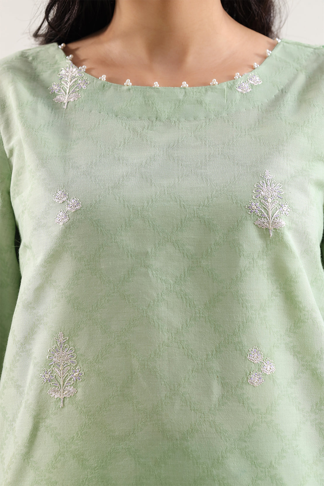 SAYA's Unstitched Solid Embroidered Self-Jacquard Three-Piece Set Features An Intricate Self-Woven Pattern Adorned With Delicate Embroidery. Crafted From Premium Fabric, It Offers A Rich Textural Appeal And An Elegant Drape. Designed For Custom Tailoring, This Ensemble Ensures A Perfect Bespoke Fit For Opulent Weddings, Eid Celebrations, And Galas, Blending Woven Sophistication With Artisanal Embellishment.